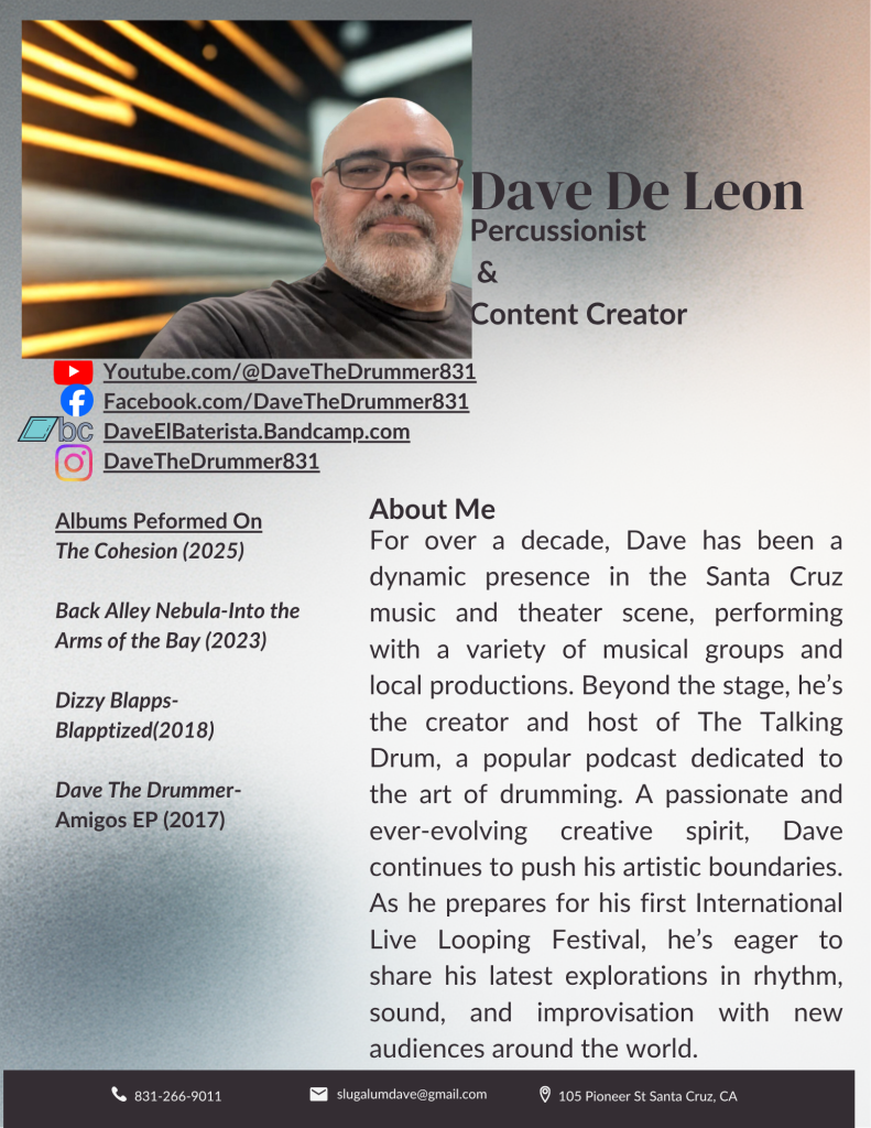 For over a decade, Dave has been a dynamic presence in the Santa Cruz music and theater scene, performing with a variety of musical groups and local productions. Beyond the stage, he’s the creator and host of The Talking Drum, a popular podcast dedicated to the art of drumming. A passionate and ever-evolving creative spirit, Dave continues to push his artistic boundaries.